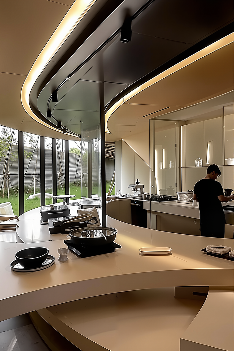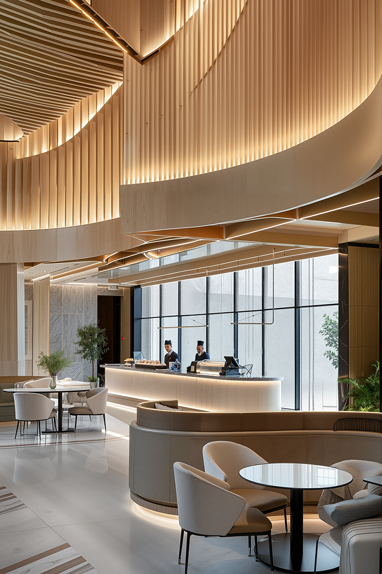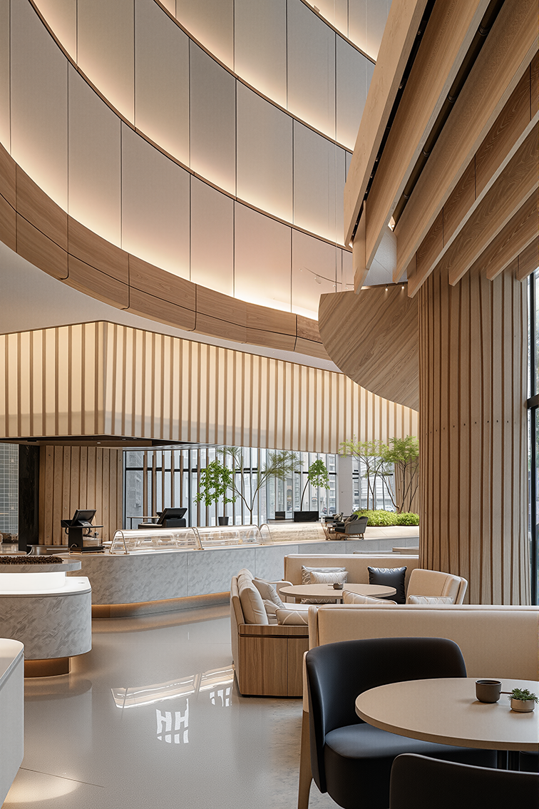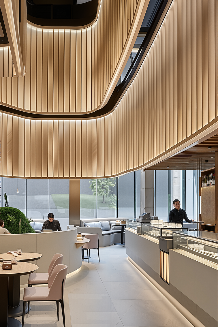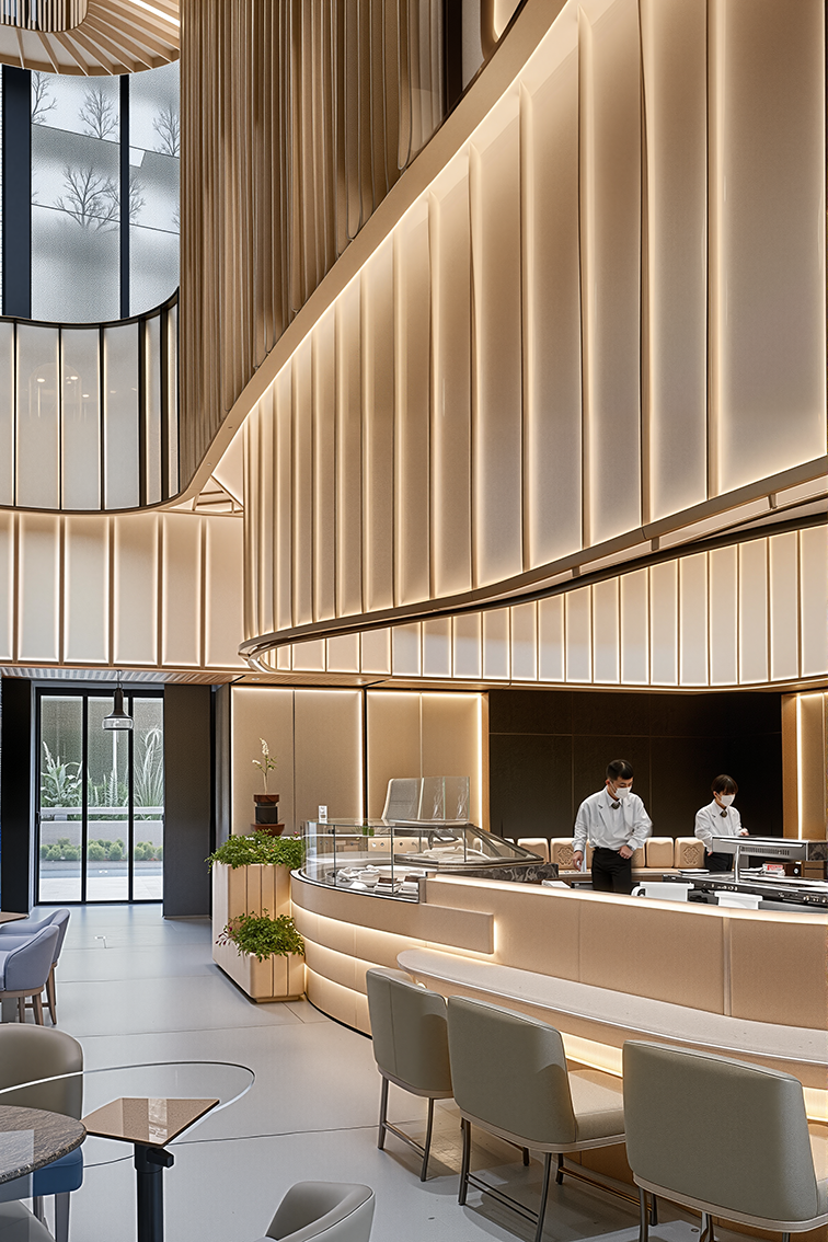 其设计并非简单堆砌绿植,而是用曲线、光影、自然造景打造沉浸式疗愈场景:曲线动线让取餐、用餐更松弛,大面积落地窗引入室外绿意,餐区与景观无缝衔接,彻底告别食堂式冰冷。同时,以场景承载品牌理念,打造专属打卡点,唤醒顾客情绪共鸣,形成“体验-分享-复购”的正向循环,让餐区成为高端品牌名片,撑起溢价空间。